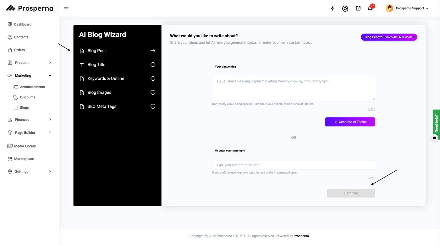 3. Choose your preferred generated topic from the options provided, then click Continue.