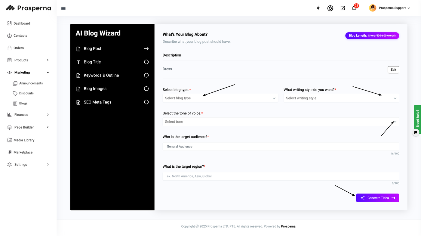 4. Complete the fields describing what your blog is about and Click Generate Titles.