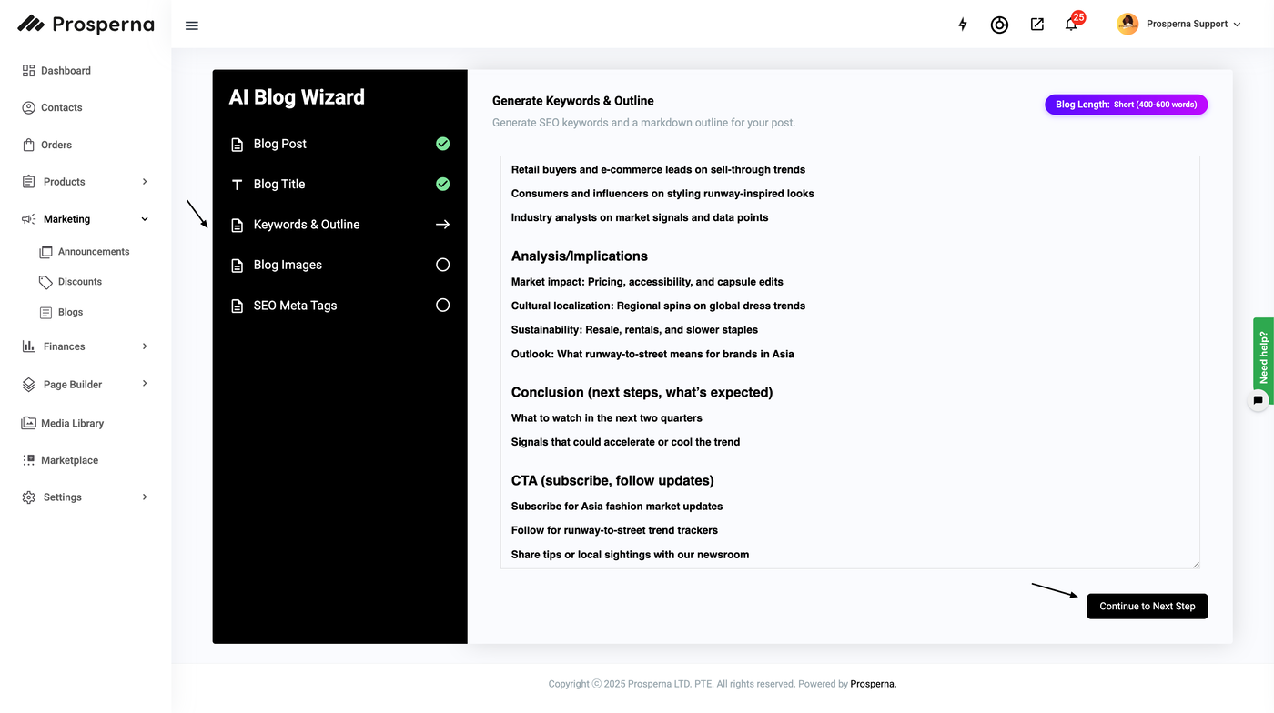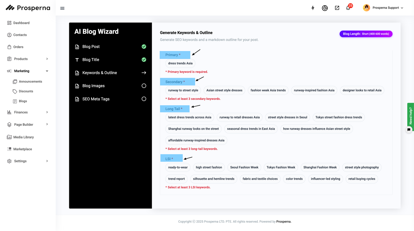 Select relevant keywords to ensure your blog is optimized for search engines.