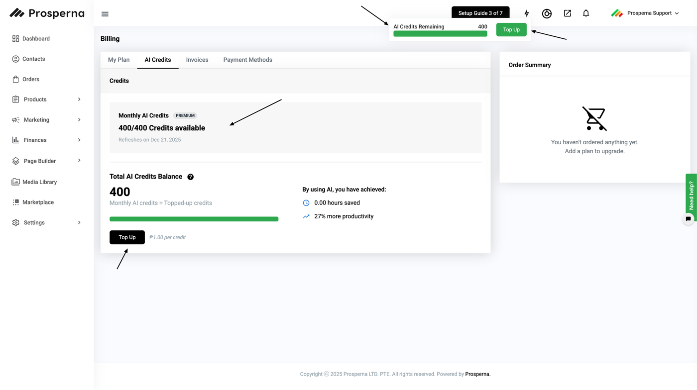 1. Go to Billing Then AI Credits or From your dashboard, open the AI Settings menu. Select Credits.