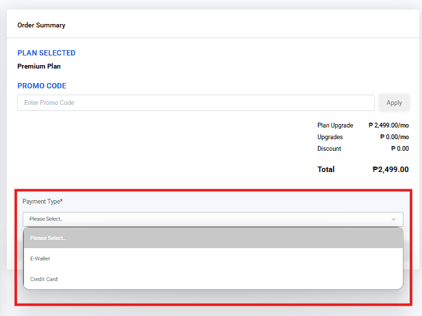 6. From the 'Payment Type' dropdown menu, click Credit Card' as your preferred payment method.