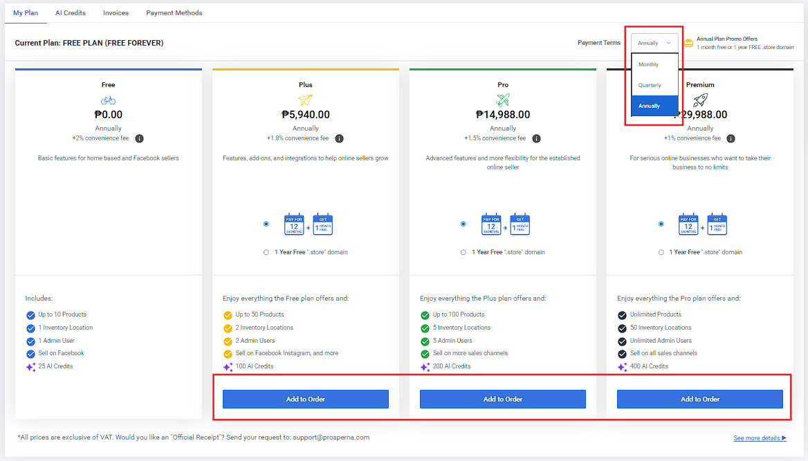3. Choose the plan you want to upgrade to by selecting from the dropdown (Monthly, Quarterly, or Annually), then click Add to Order.