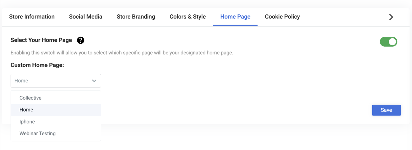 - Custom Homepage - Select your desired homepage from the dropdown menu of your published pages.