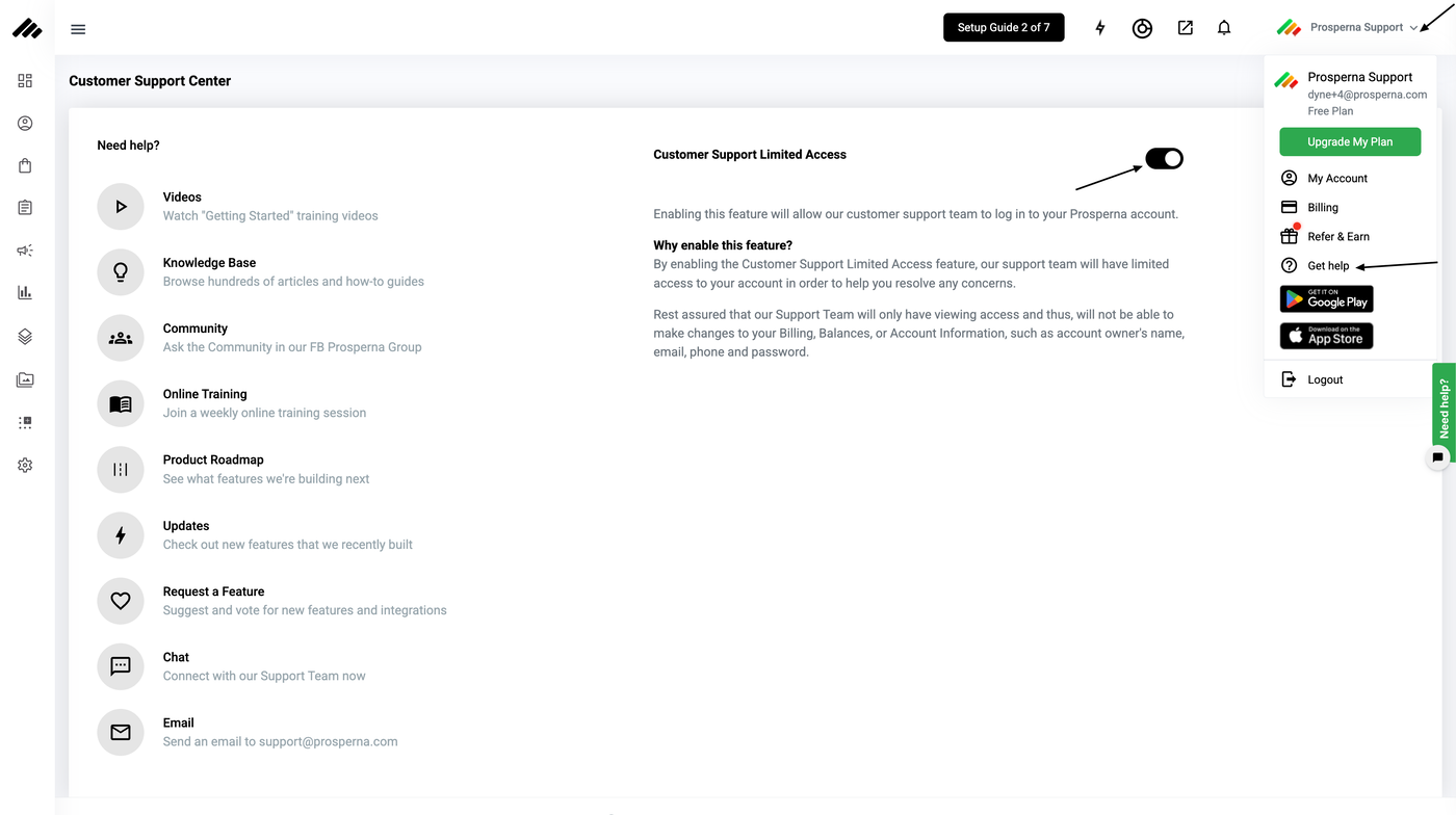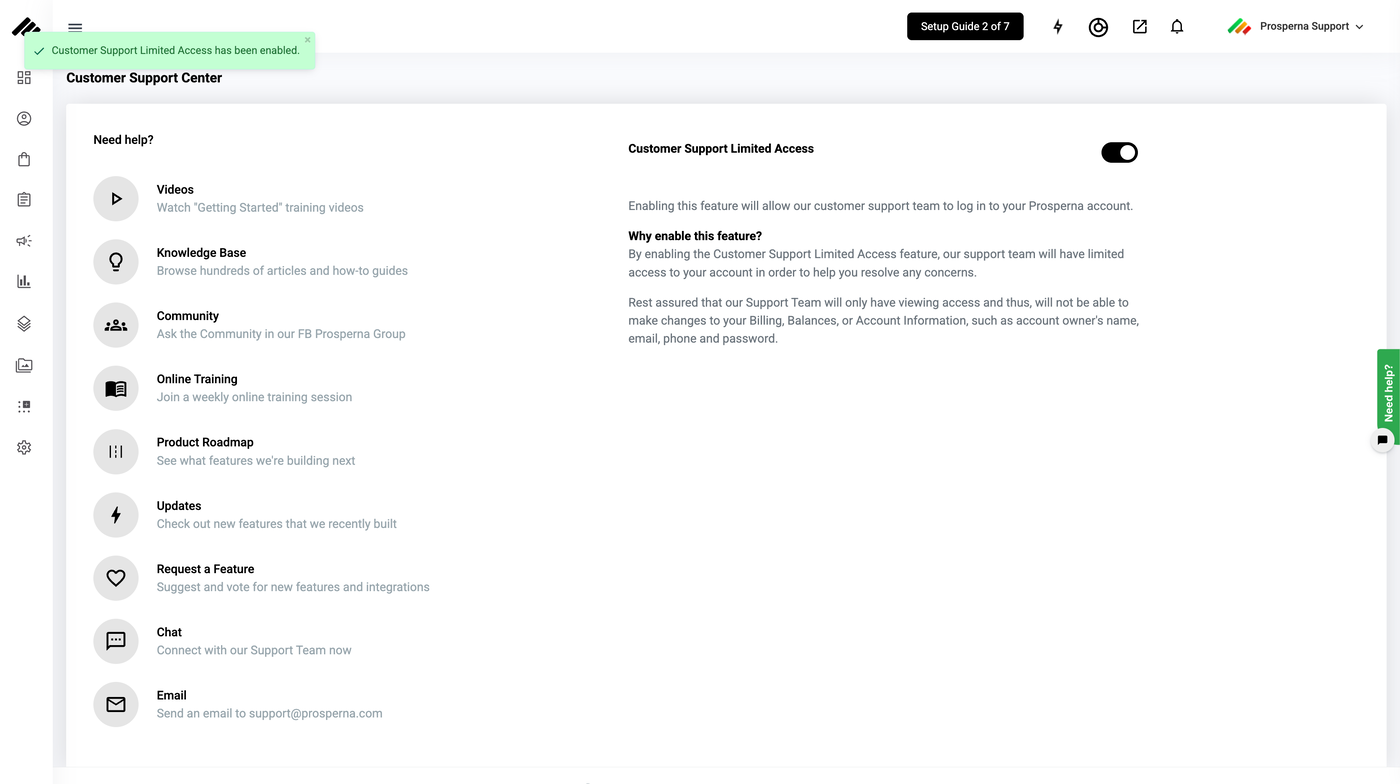 This feature allows our Customer Support team to log in to a merchant's Prosperna account with limited access. That means we won't be able to edit Personal Information such as the Account owner’s name, phone, and email. They will use their access to address and assist you.