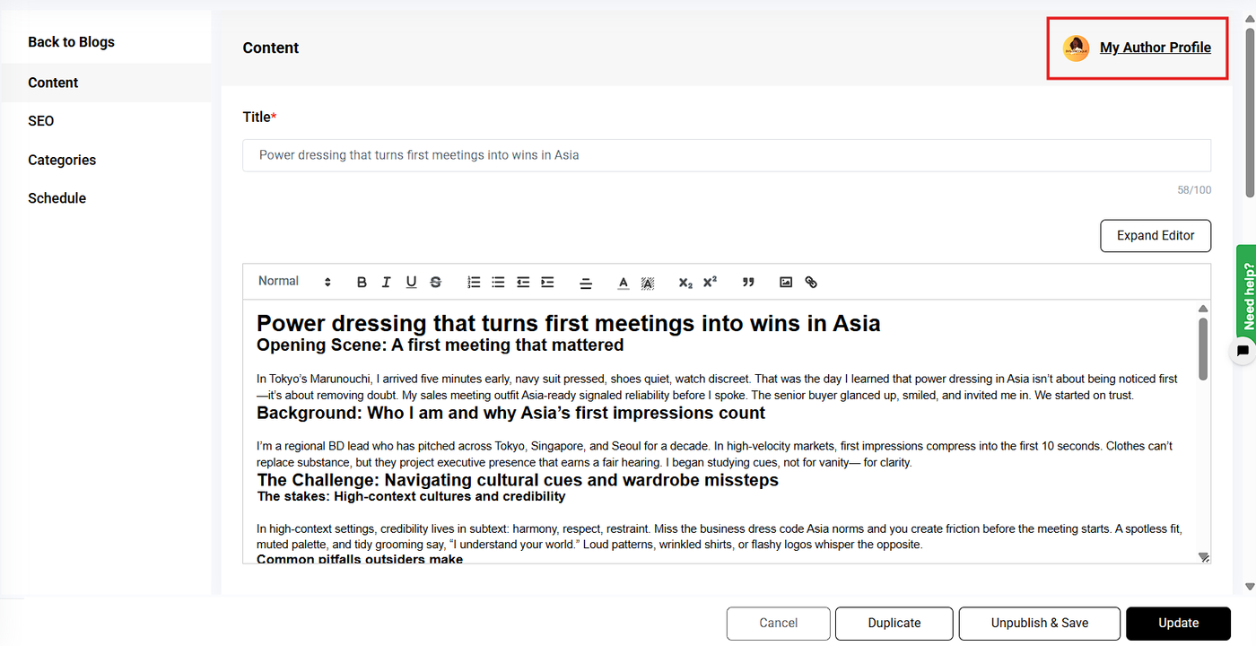 Why Is It Important? Updating your Author Profile ensures your blog content displays the correct author information and maintains consistency across your published articles. Changes made here will apply to newly created blog posts, while existing posts will retain the author name saved at the time they were published.