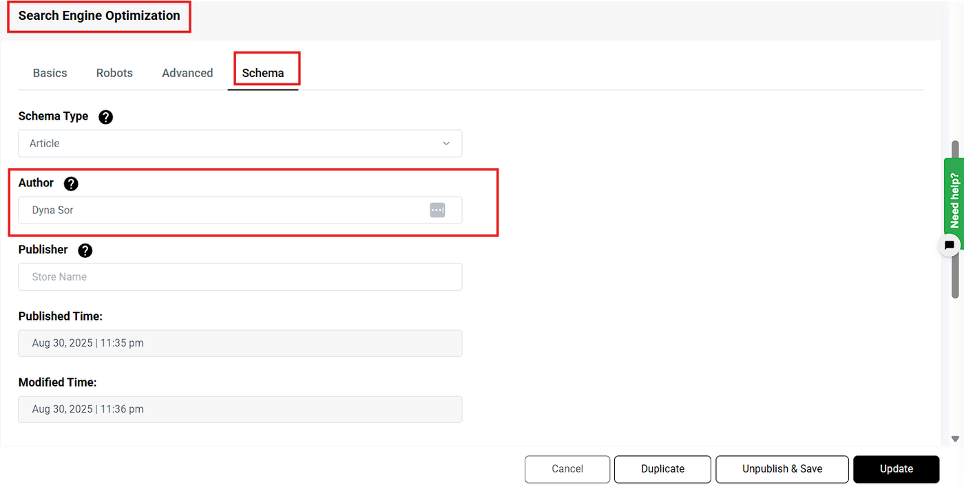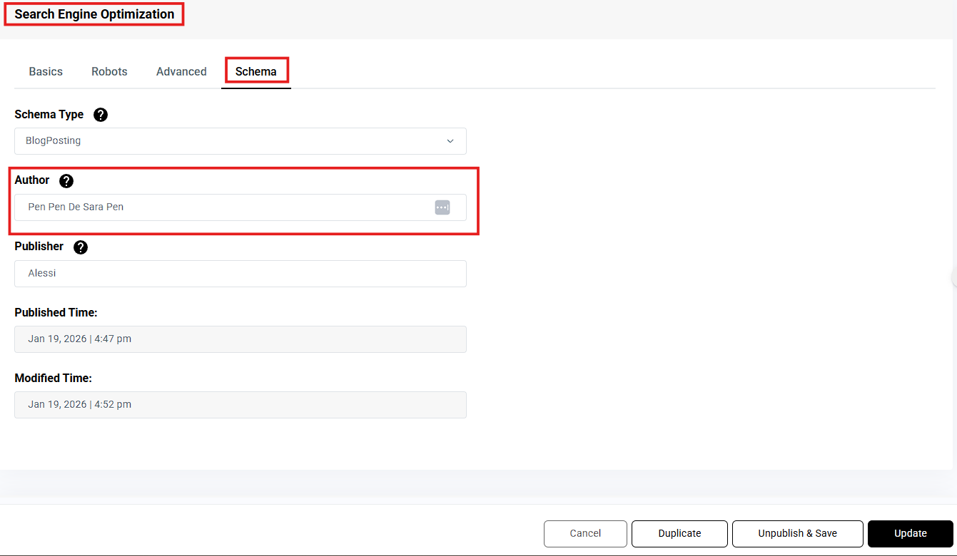 The Schema Author may still be overridden at the individual blog post level if needed.