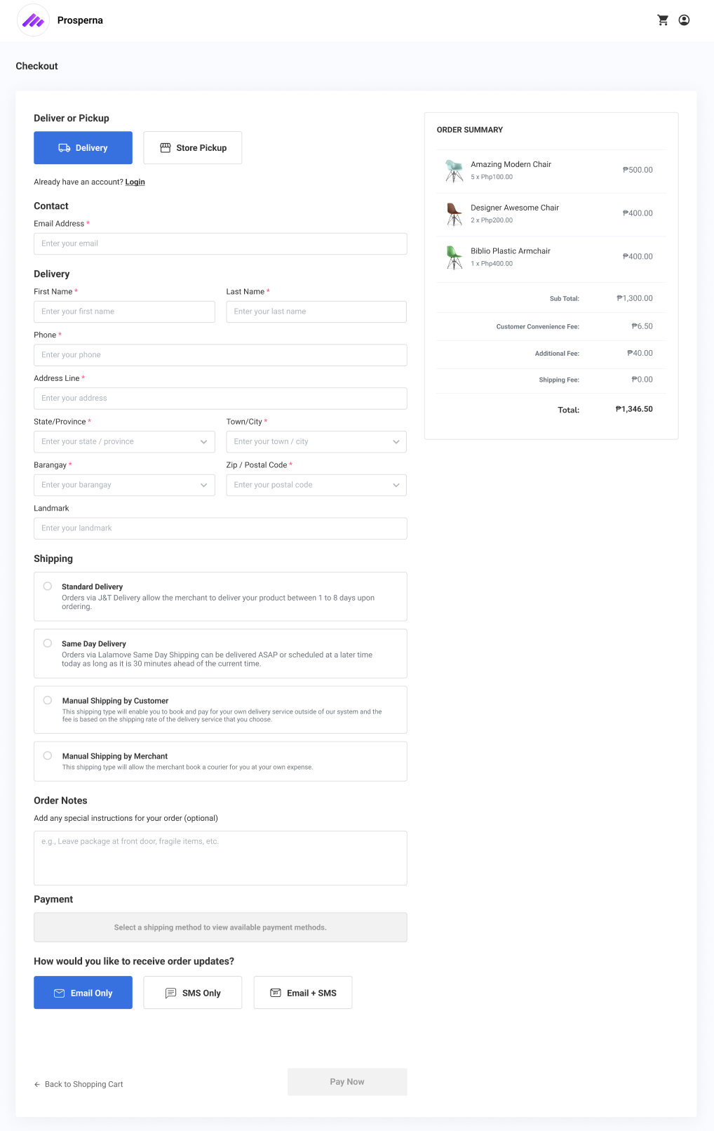 (Contact → Delivery/Pickup → Shipping → Payment → Order Notes → Order Updates).