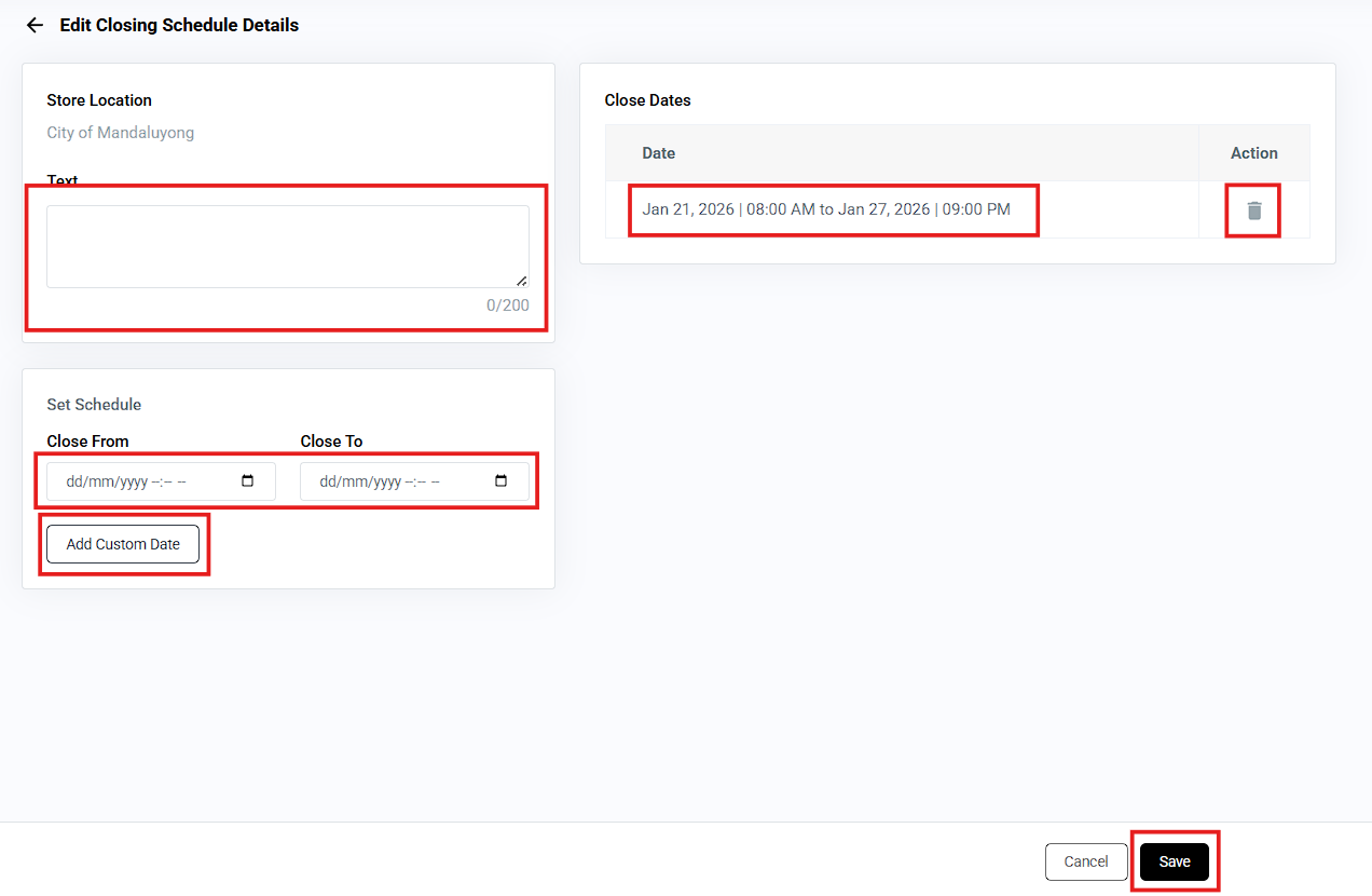 The Temporary Close feature allows you to temporarily stop accepting orders for specific store locations during a selected date and time. This is useful for holidays, maintenance, unexpected closures, or special circumstances.