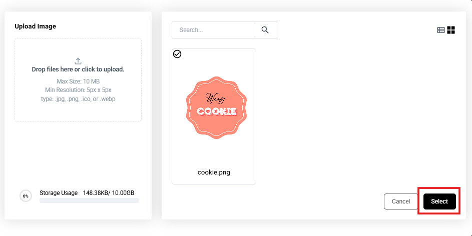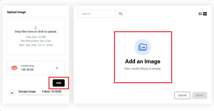 4. Click the box on the right side or drag your image to the box. After the image has uploaded, click Add button.