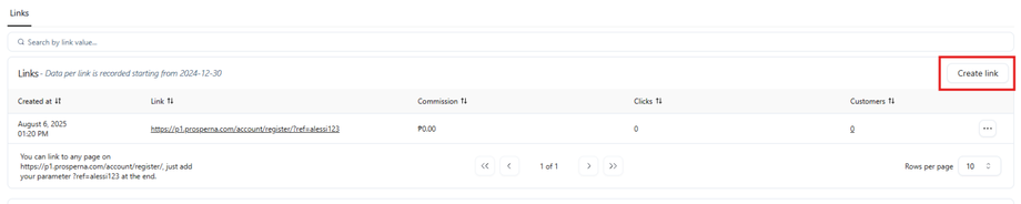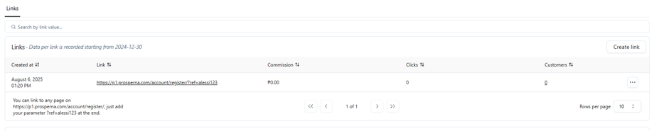 - Under the 'Link ↑ ↓' column, you’ll find your referral link displayed.