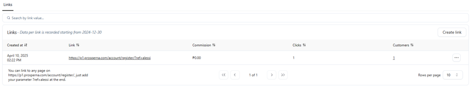💡You can create a new referral link by clicking the Create link button. You may also add ?ref=yourusername to any Prosperna page URL.