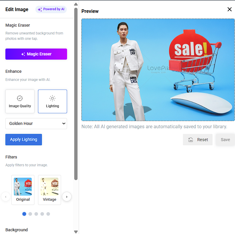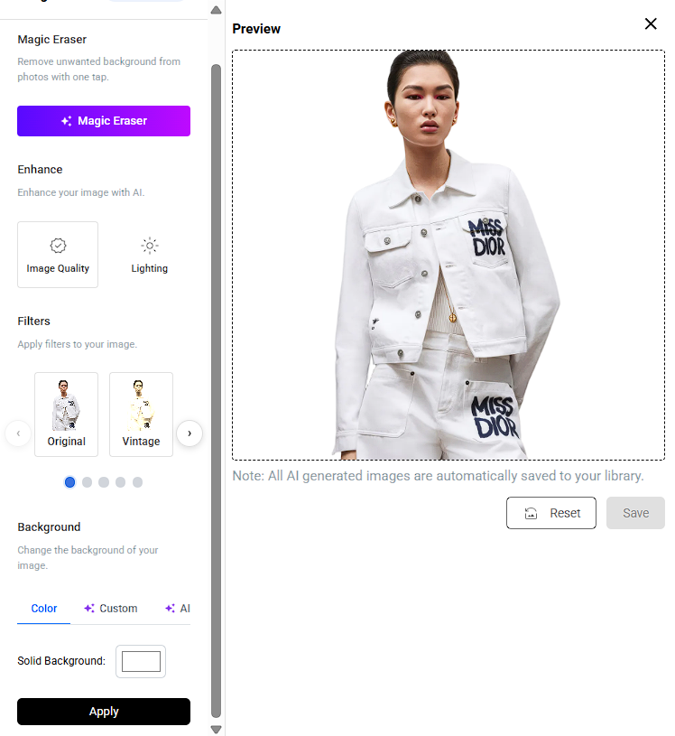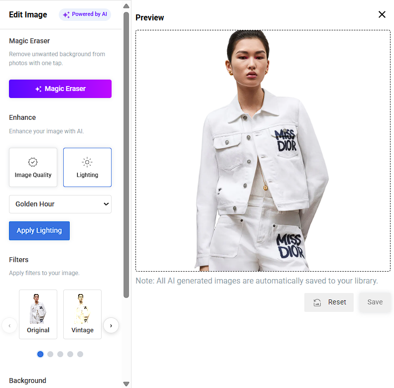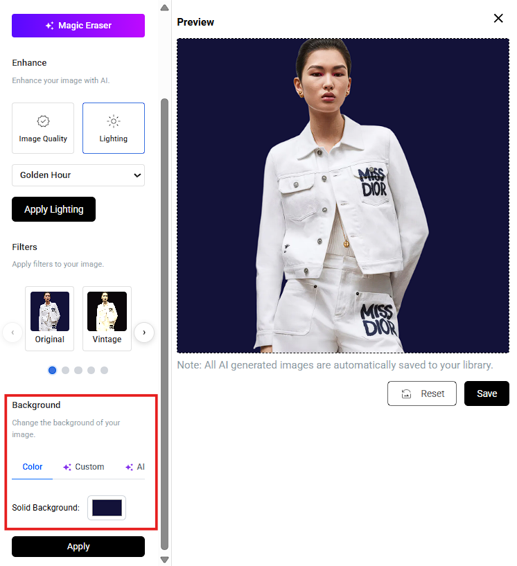 Choose the enhancement type: Magic Eraser, Enhance, Filters, or Background (Color, Custom, AI).