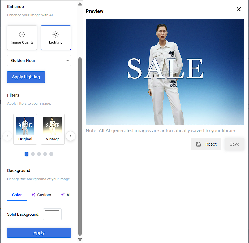 Enhance your product images directly from the Media Library with built-in AI tools. With just a few clicks, you can improve image quality, adjust lighting, remove unwanted elements, and even change backgrounds. This helps ensure your store looks professional and visually appealing to customers, ultimately boosting their confidence to purchase.