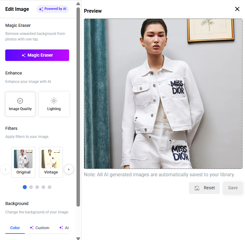 Background Options – Add solid colors, upload custom backgrounds, or generate AI backgrounds with your own description.