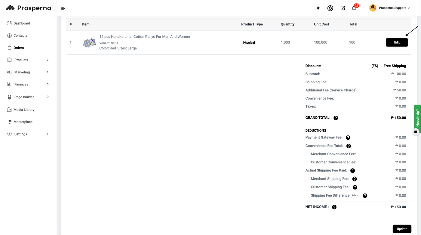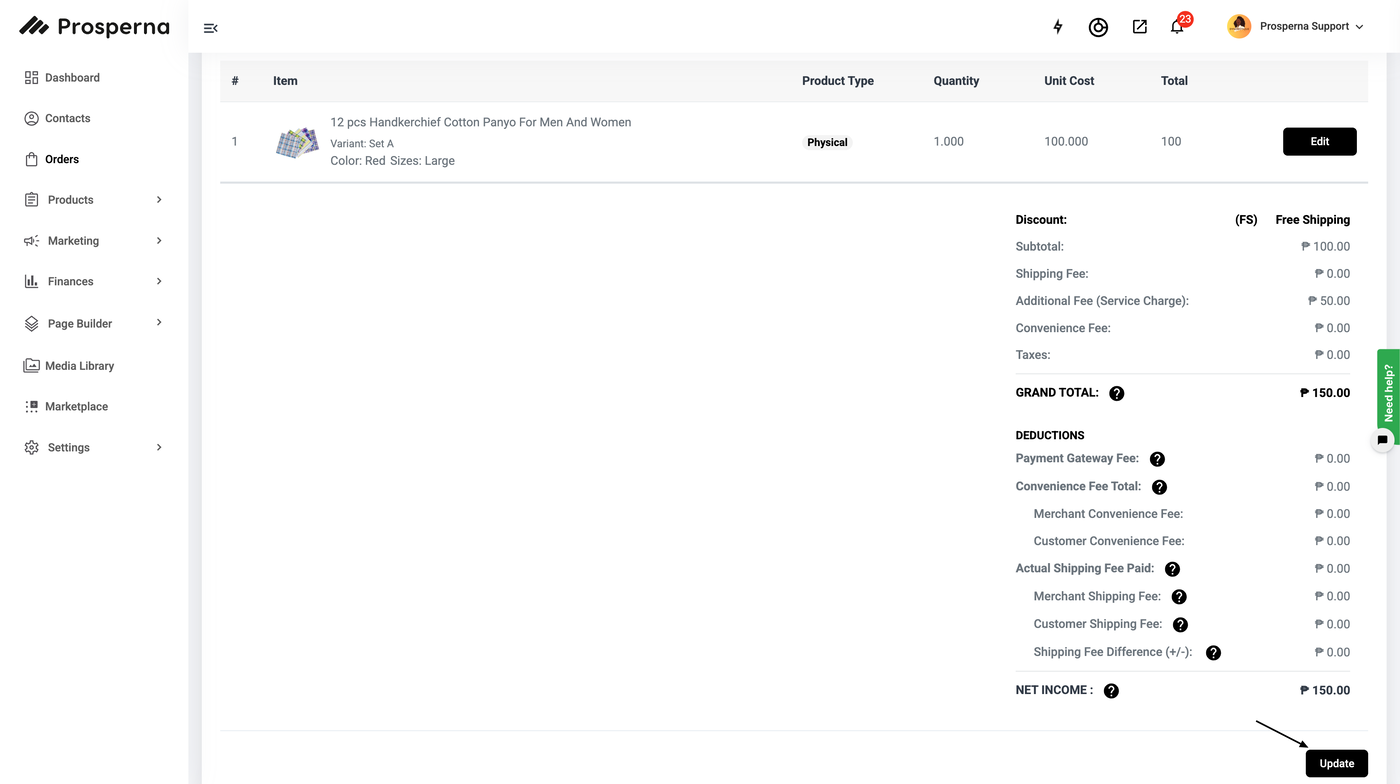 5. Click Save and the Update button to successfully apply all changes to the order.