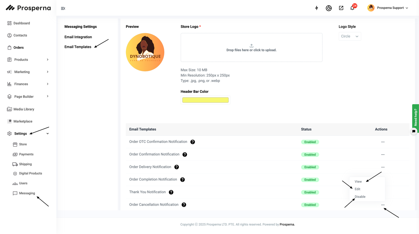 3. Under the Email Notification Template, select 'Edit' under Actions for the Order Cancellation Notification