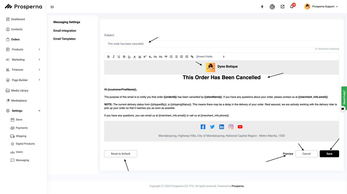 Under the Email Notification Template, select 'Edit' under Actions for the Order Cancellation Notification