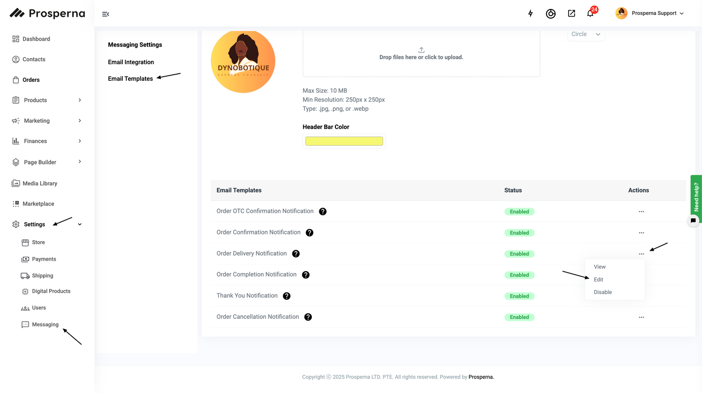 3. Under the Email Notification Template, select 'Edit' under Actions for the Order Delivery Notification