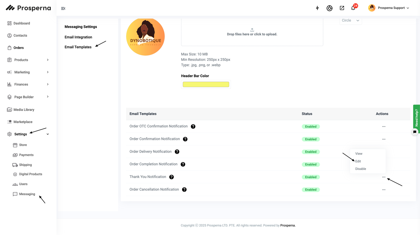 3. Under the Email Notification Template, select 'Edit' under Actions for the Thank You Notification
