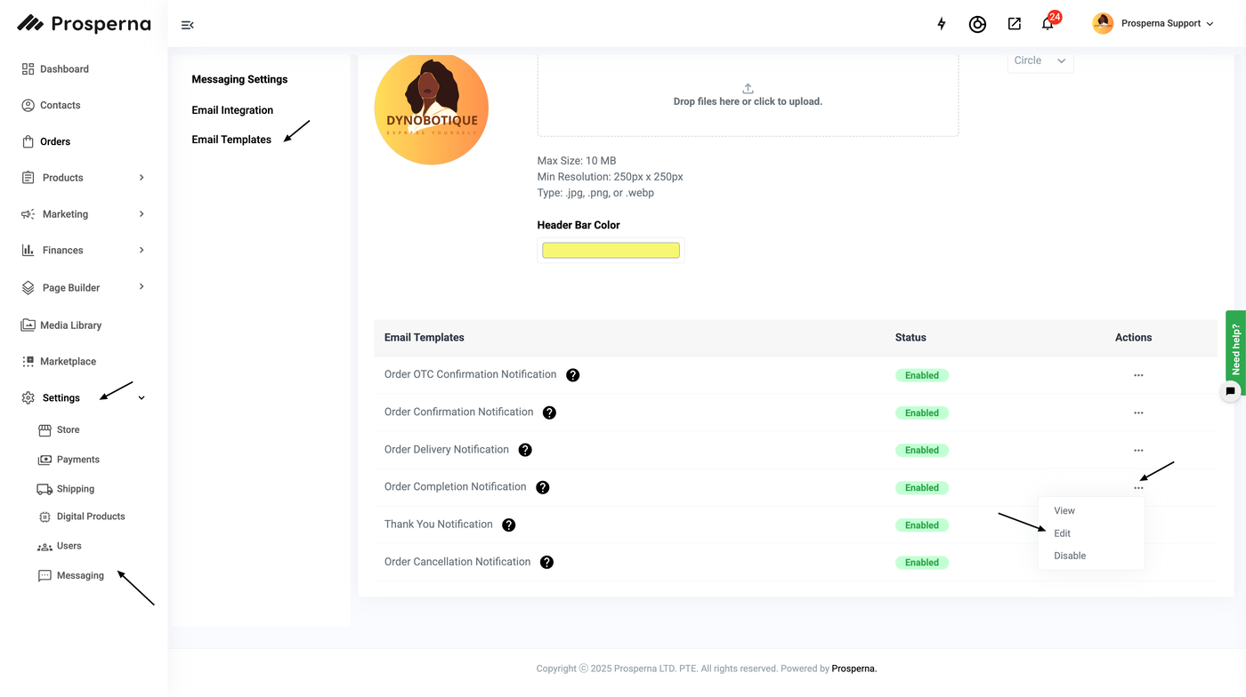3. Under the Email Notification Template, select 'Edit' under Actions for the Order Completion Notification