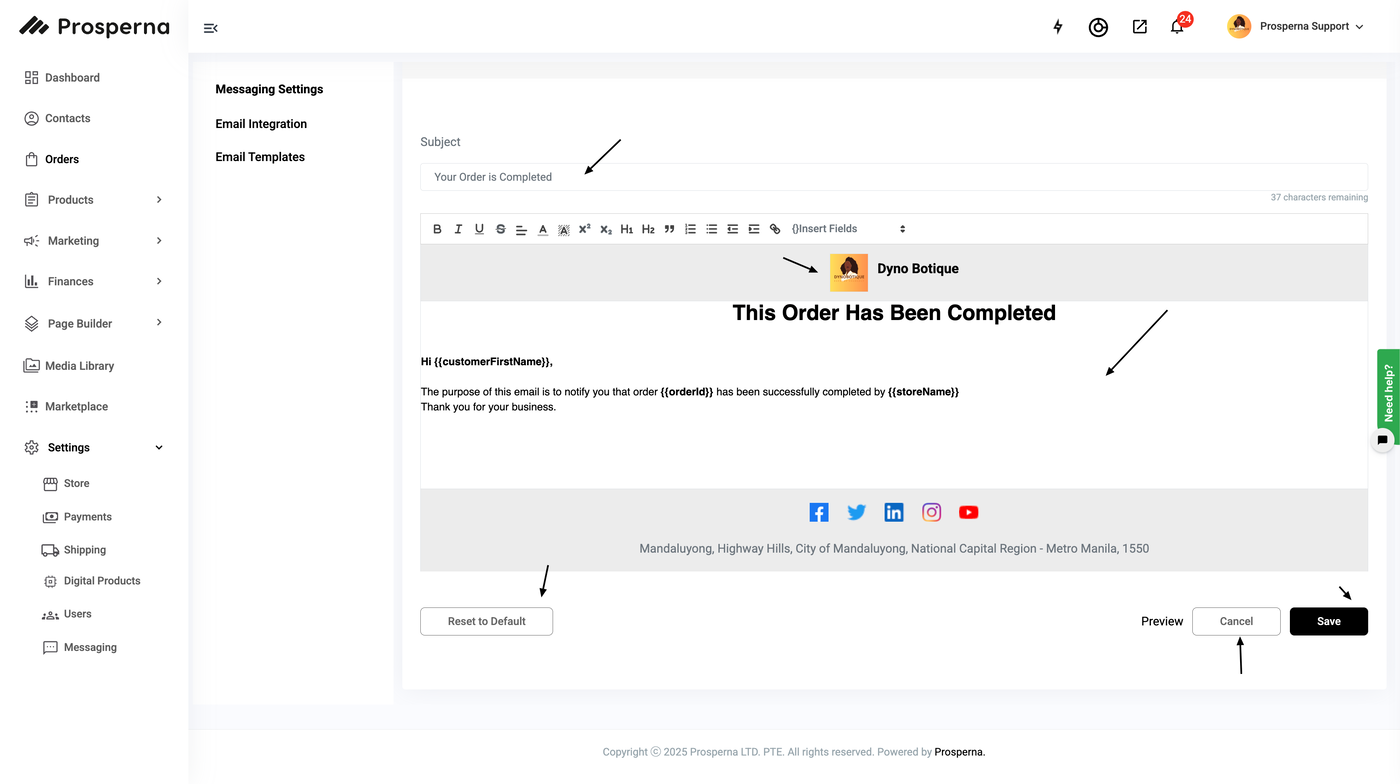 Under the Email Notification Template, select 'Edit' under Actions for the Order Completion Notification