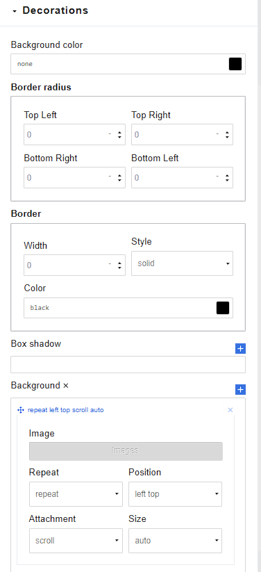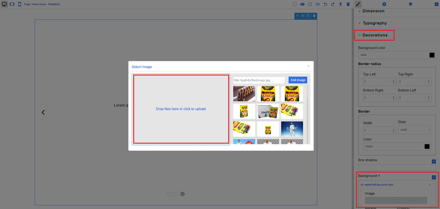 To add a background on your hero, scroll down to decorations and click Image to upload the background.