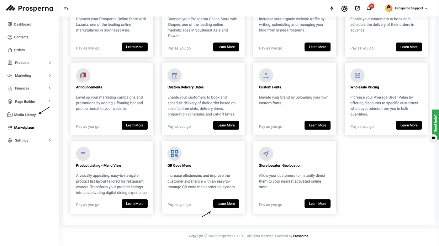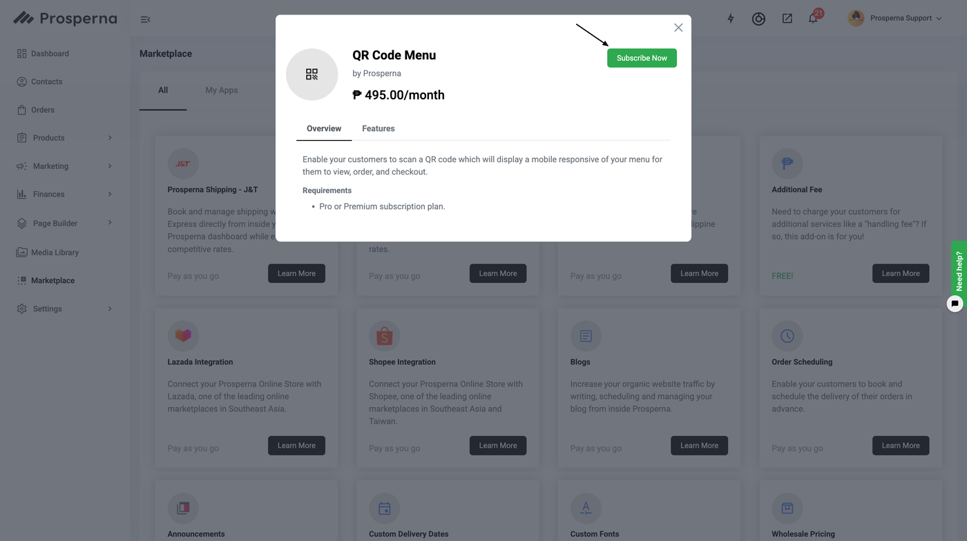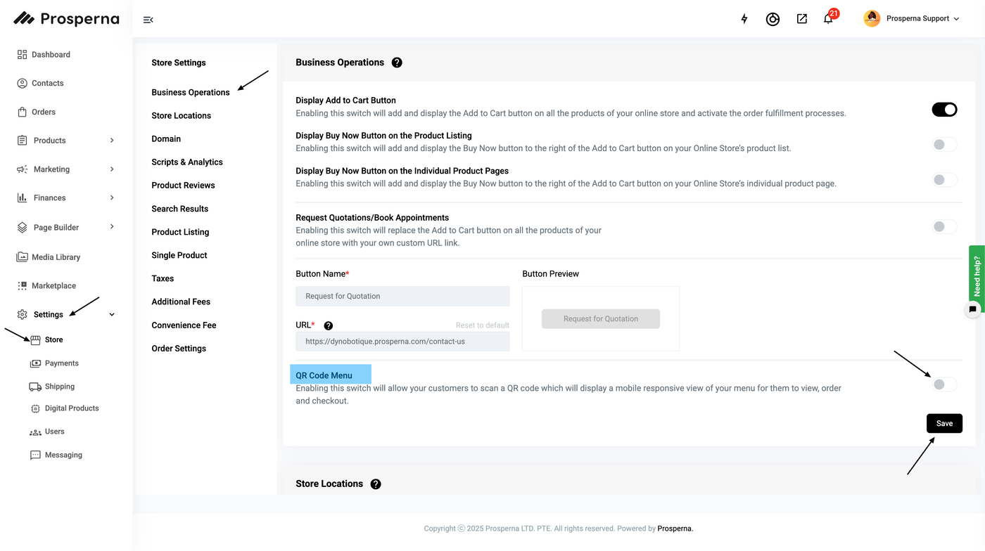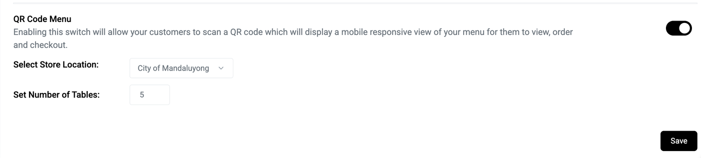 Scroll down, locate the QR Code Menu (for dine-in customers), and enable the button.
