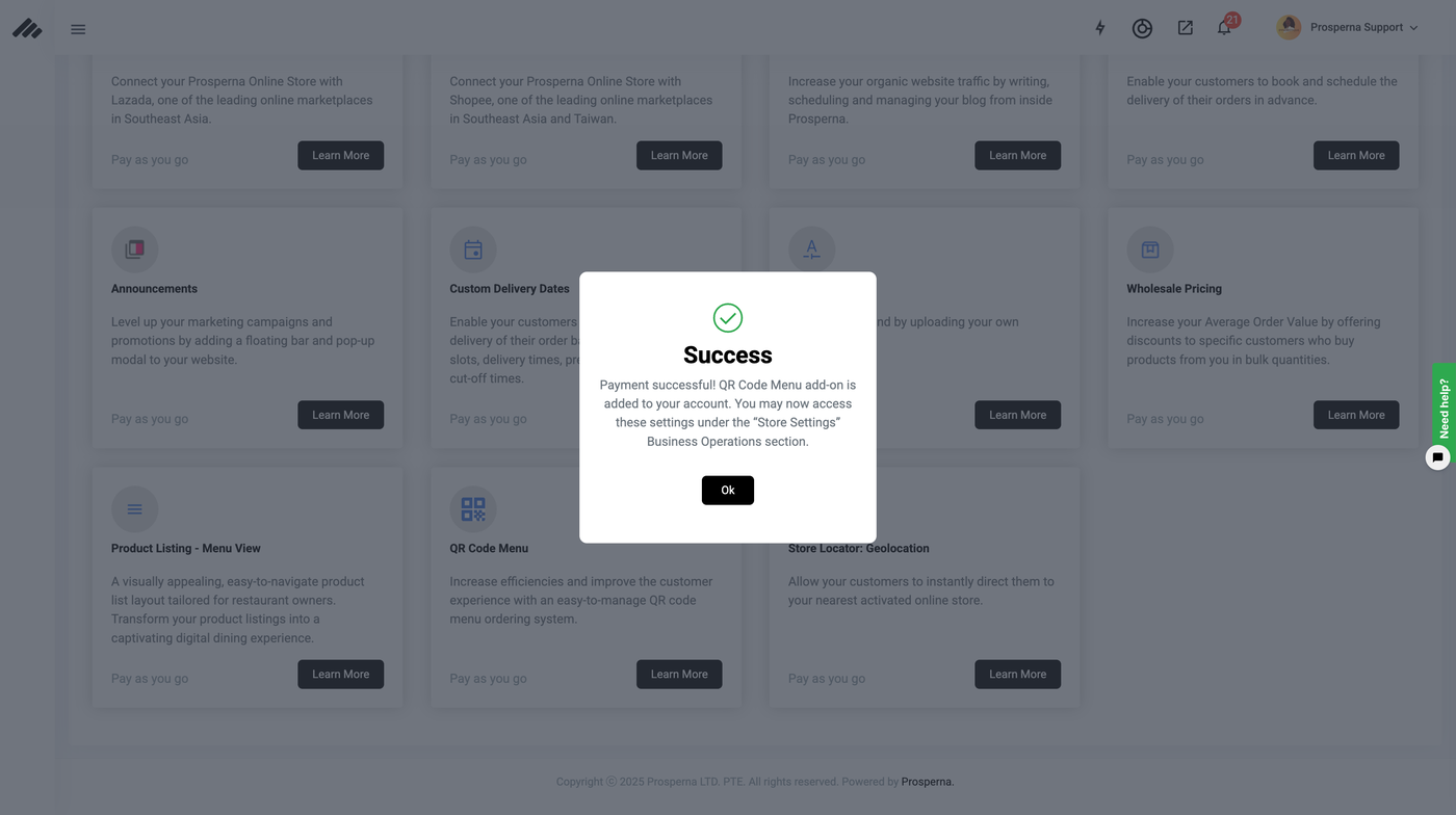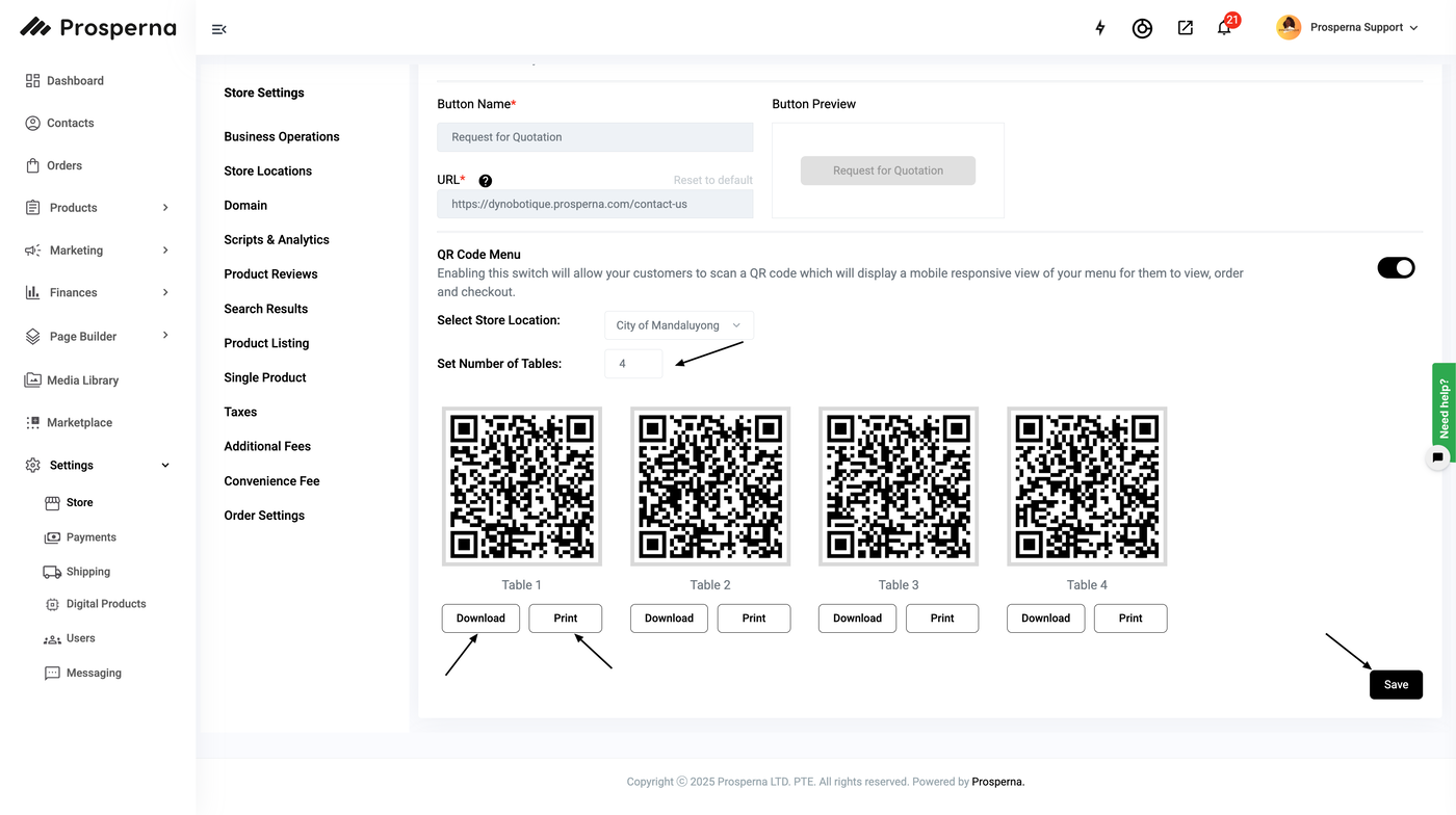 Result: You have successfully enabled the QR Code Menu for dine-in customers. The QR codes for each table have been generated, and you can now download or print them for placement in your store.