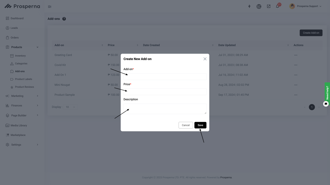 Add-on – Enter the name of the Add-on you want to offer. This is the label that will appear to customers when they view or select the Add-on.