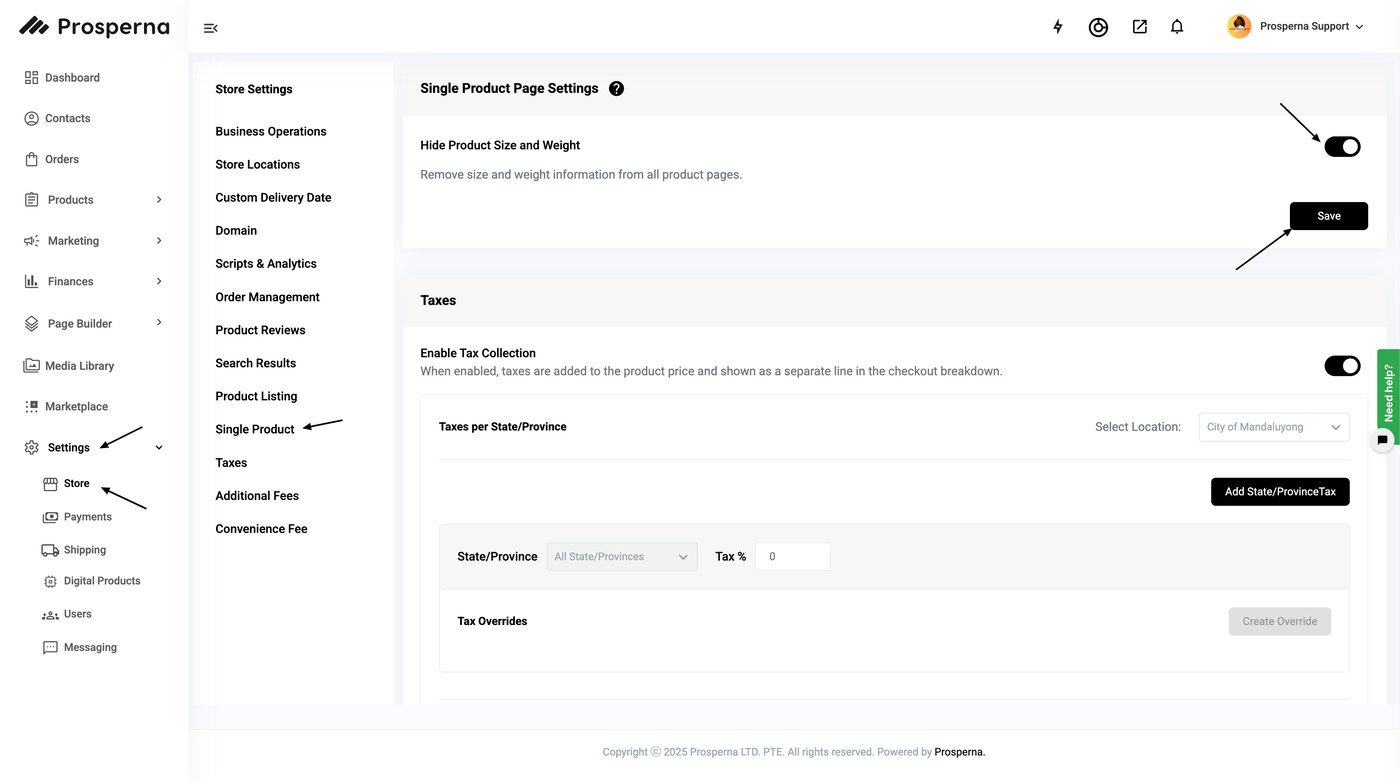 3. Go to Single Product Page Settings and Toggle the Hide Product Sizes and Weight for all products
