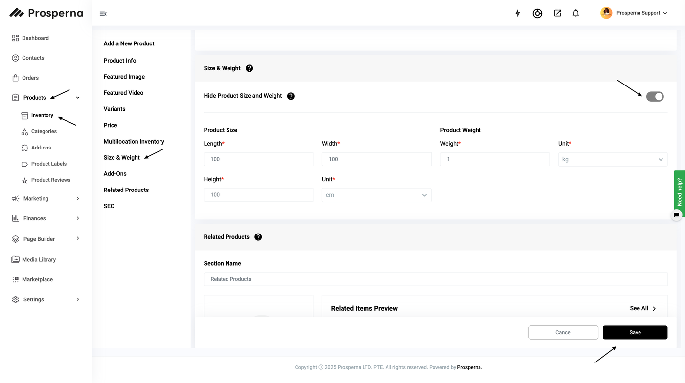 3. Go to Size & Weight and Toggle the Hide Product Size and Weight button.