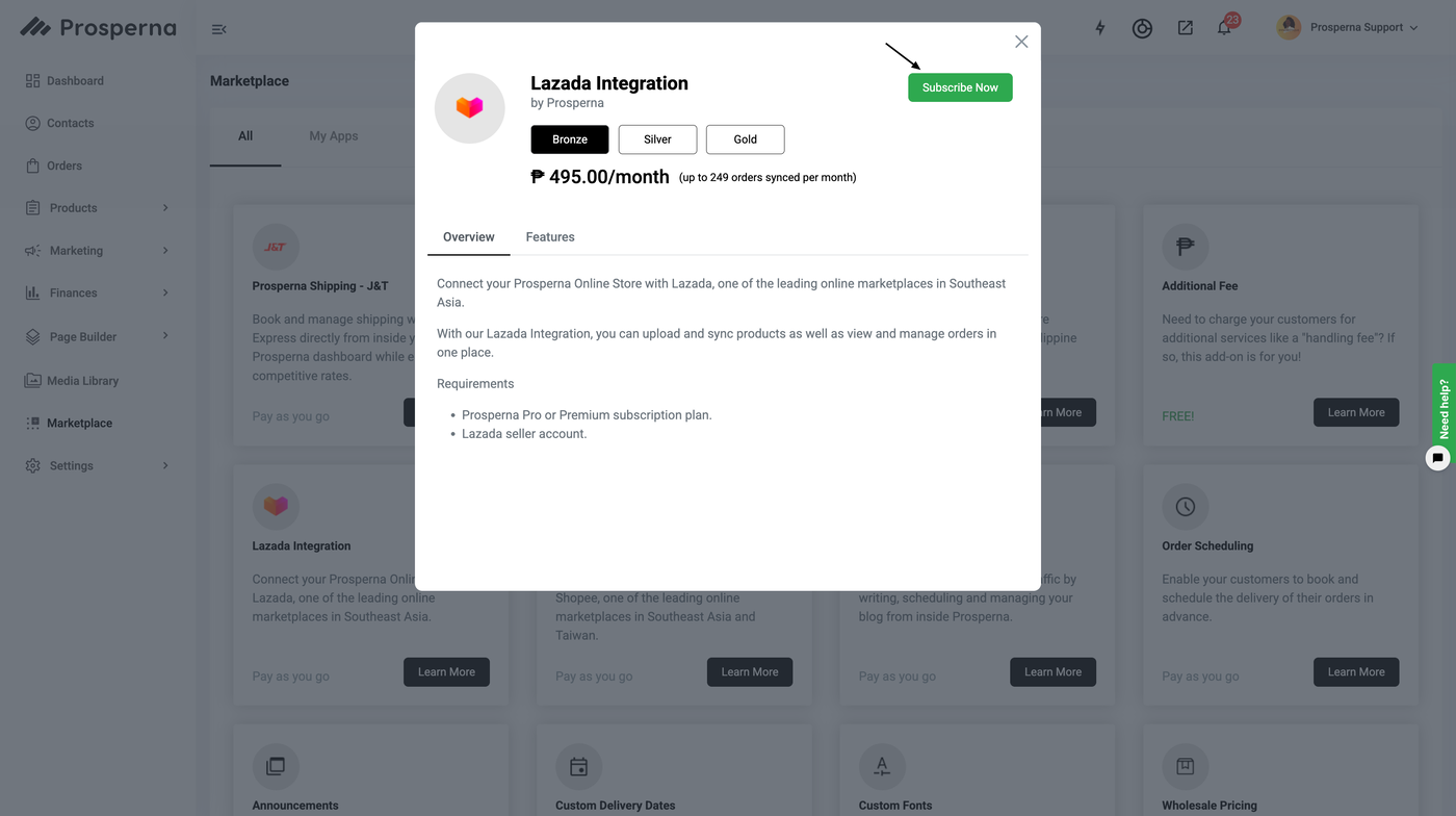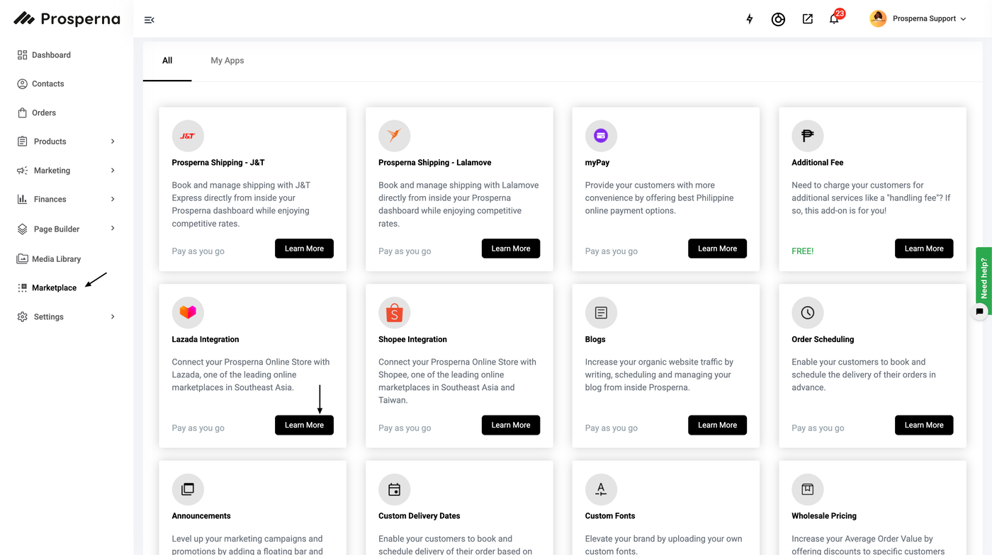 7. Once the Lazada/Shopee Open Platform app authentication in step 4 is successful, you will be redirected back to the Marketplace under the “My Apps” tab where you will see the previous “Activate” button now becomes “Manage” button, and that is now a clear indication that your Lazada/Shopee Seller Account is successfully integrated with your Prosperna Merchant Account and your Lazada/Shopee Integration is fully activated.