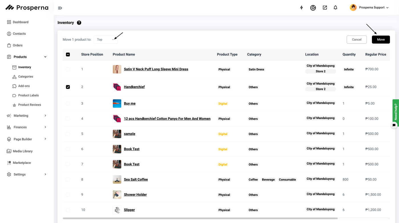 Top: The selected products will move to the top of the list. If you select more than it will just follow the position of the first.