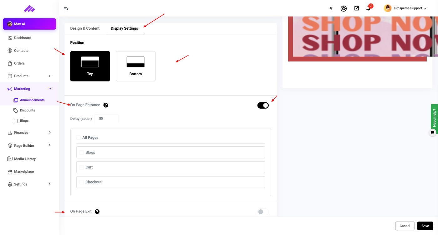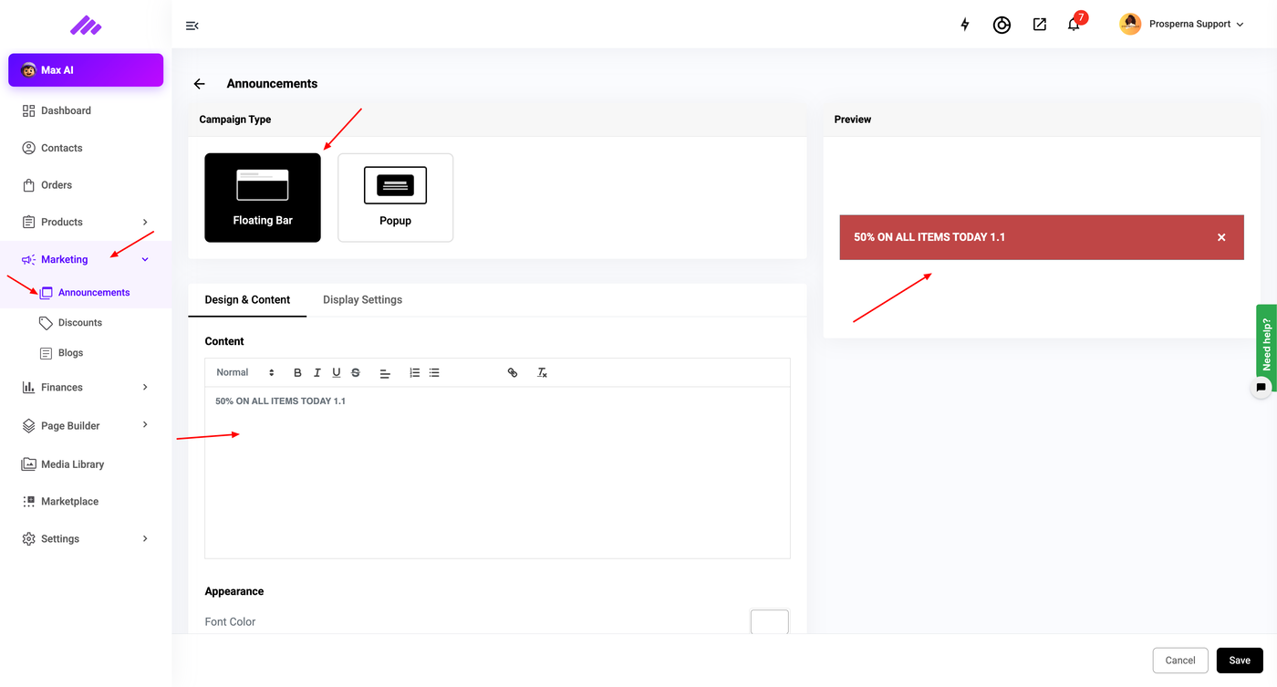 4. Go to Marketing, select Announcements