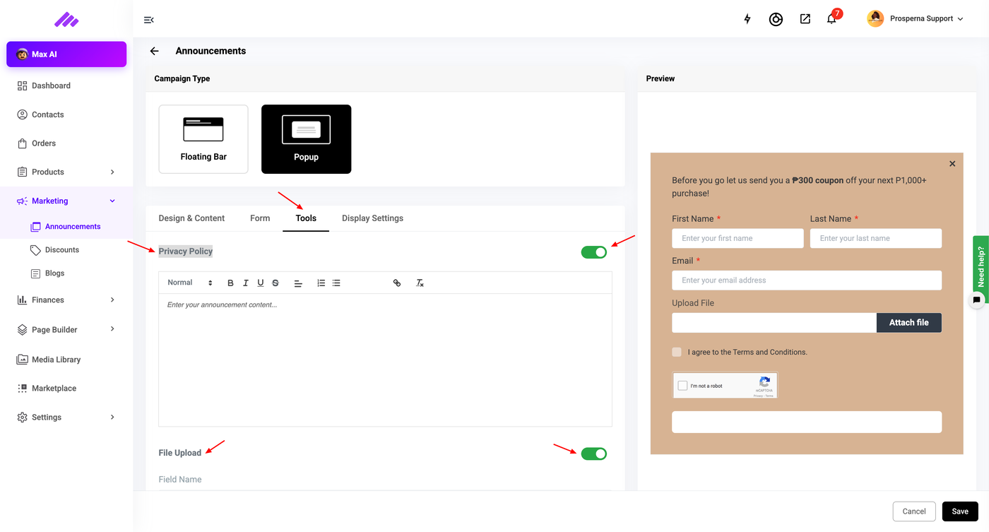 Tools - To add additional requirements for the forms like Privacy Policy, File Upload, Captcah, ReCaptcha.