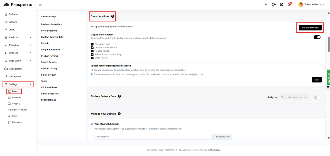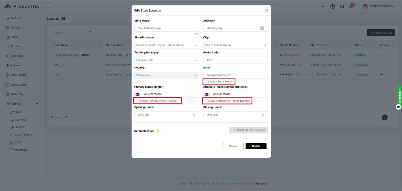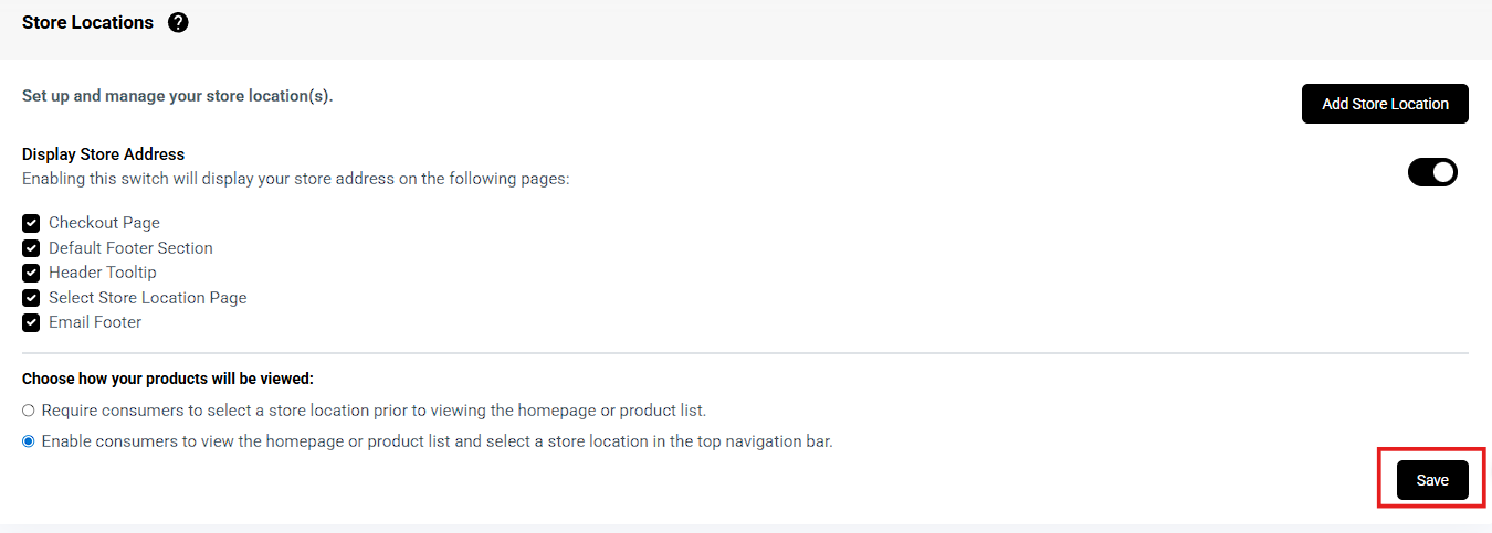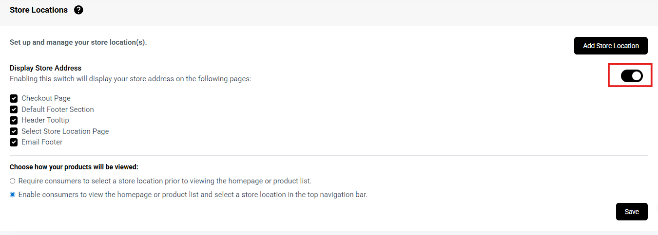 Manage where the address appears (e.g., Checkout Page, Footer Section, Header Tooltip, or Store Selector).
