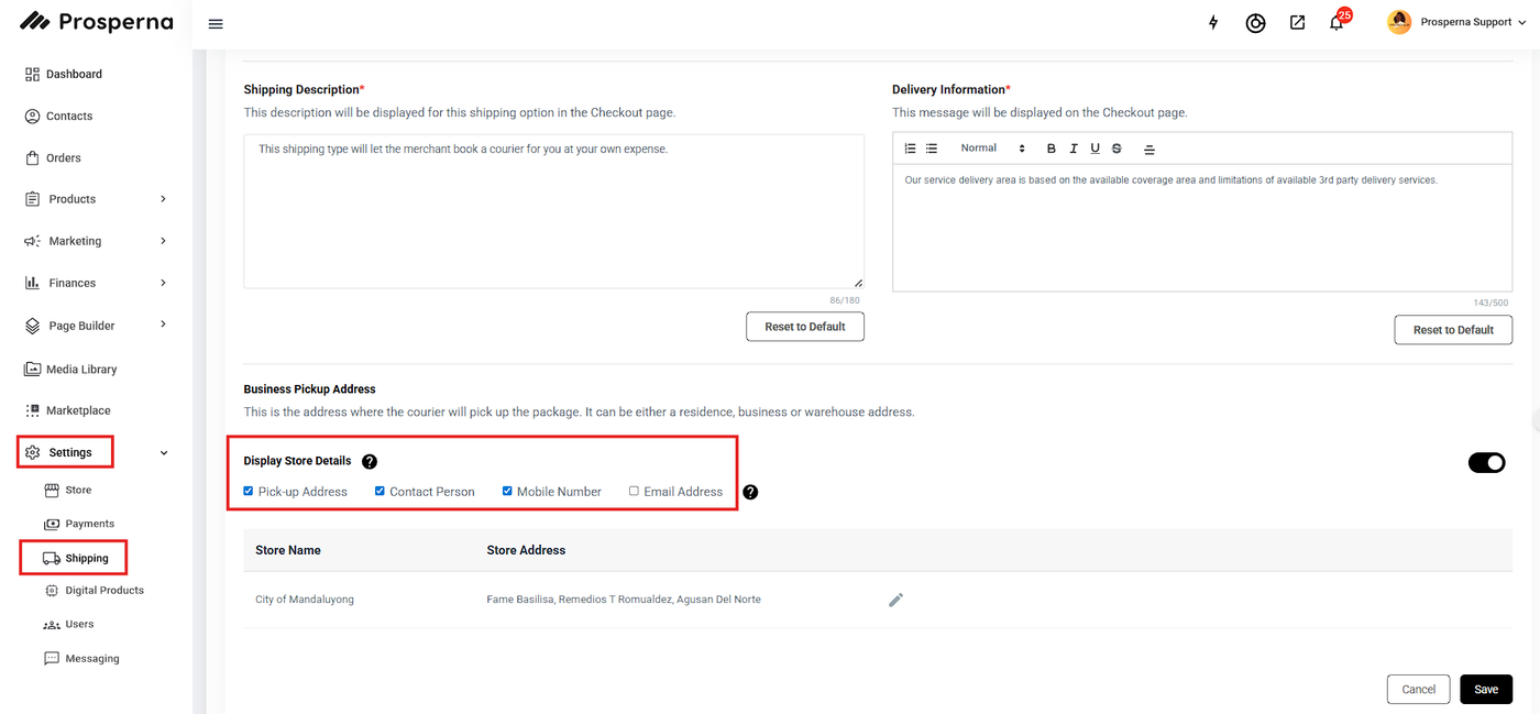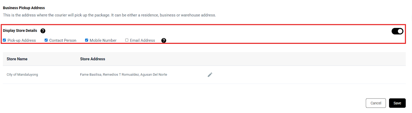 The "Display/Hide Address" feature allows you to toggle the visibility of the Business Pickup Address for a shipping option on your site. By enabling or disabling this setting, you can control whether the store address and other information will appears.