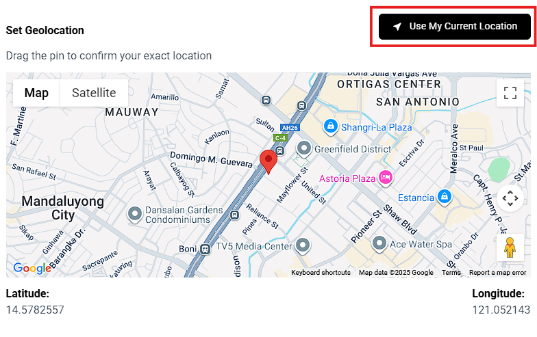 Drag the pin to confirm your exact location or click 'Use My Current Location'.